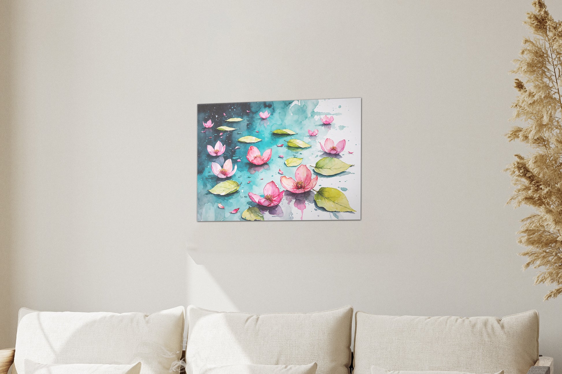 Pink lotuses mirrored on calm waters. A tranquil metal poster décor celebrating balance and renewal. In many cultures, the lotus is a symbol of purity and enlightenment.